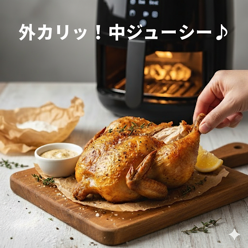 出来上がった鶏の半身揚げは、見た目もプロ顔負け。食べてみると、外はカリッカリ、中は驚くほどジューシー!油で揚げていないのに、こんなに美味しくできるなんて、正直感動しました。